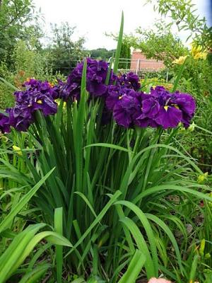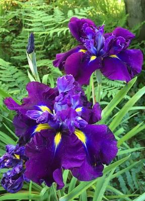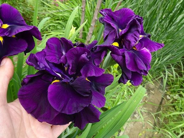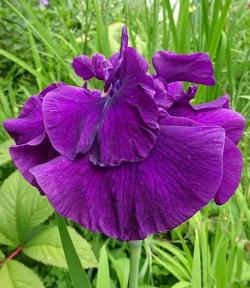 Ирис мечевидный (японский) Eileen's Dream (Айлинс Дрим). Цветки красивые, махровые (9-12 лепестков), тёмно-фиолетовые, бархатистые, однотонные, с жёлтым сигналом. Стайлы чёрно-фиолетовые. Цветение в июне-июле. Высота 80-90 см. Место солнечное или полутенистое. Почва плодородная, умеренно кислая, летом постоянно влажная, но без застоя воды.