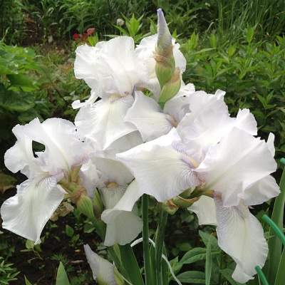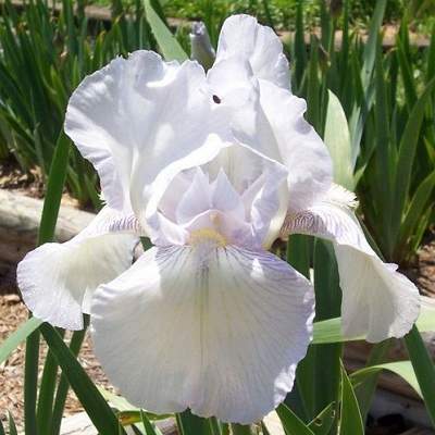 Ирис English Cottage (Инглиш Котэдж). Неприхотливый надежный сорт с регулярным обильным цветением. Роскошные белые цветки, словно покрытые сиреневой изморозью по краю лепестков. Цветки оригинальной формы, на прочном разветвленном цветоносе. Высота 80 см. Цветение в июне.