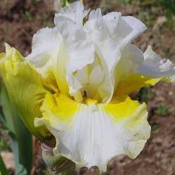 Ирис Epatant (Эпатан). Стандарты белые с жёлтым оттенком в основе. Фолы белые с широкими золотисто-жёлтыми плечами. Бородка золотисто-жёлтая. Цветоносы отличные, с идеальными многоуровневыми ответвлениями, несущими в среднем по 9-10 бутонов. Срок цветения поздний. Высота 95 см.