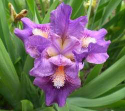 Ирис бородатый — многолетнее корневищное растение. Цветки оригинальной формы на прочном разветвленном цветоносе. На наружных долях околоцветника находится бородка из густых волосков. Листья мечевидные с восковым налетом, собраны в вееровидные пучки. Есть низкорослые и карликовые сорта.