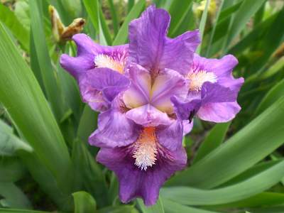 Ирис бородатый карликовый Exotic Air (Экзотик Эйр). Очаровательный сорт. Стандарты и фолы сиреневые, вокруг бородки темное пятно. Бородка в основании оранжевая, на кончике белая. Красивая гофрировка. Свежий необычный цвет. Высота 30 см.