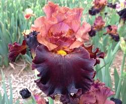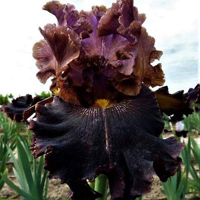 Ирис высокий бородатый Fabulous Fortune (Фэбьюлос Фочен). Стандарты каштановые, фолы черно-красные с кремовыми жилками. Бородка оранжевая. Великолепная форма, гофрировка и кружева. Высота 89 см.