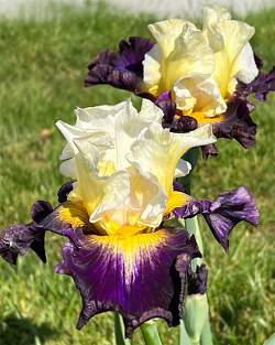 Ирис высокий бородатый Flash of Brilliance (Флэш ов Бриллианс). Стандарты белые с лимонным жилкованием. Фолы пурпурные с ярко-желтой вспышкой у бородки. Бородка желто-оранжевая. Красивая гофрировка. Парящий. Цветок крупный. Срок цветения средний. Высота 84 см.