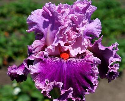 Ирис высокий бородатый Flutterina (Флаттерина). Стандарты розовато-сиреневые. Фолы пурпурно-фиолетовые с розовато-сиреневой каймой. Бородка мандариновая. Высота 102 см. Срок цветения средний. Роскошный, с двойными кружевами, гофрированный.
