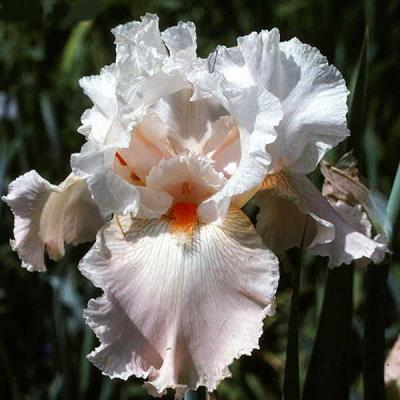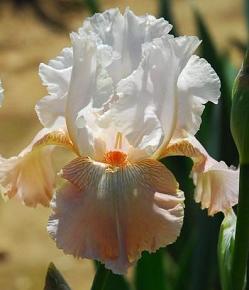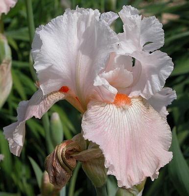 Ирис бородатый Frappe (Фраппэ). Стандарты изменчивой окраски, от очень бледно-клубнично-розового до розовато-белого. Фолы немного более глубокого бледно-клубнично-розового цвета, смешанного с очень бледно-малиново-розовым с белыми полосками в основе. Бородка оранжево-мандариновая, немного взъерошенная. Аромат апельсиновый.