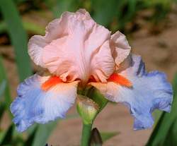 Ирис French Cancan (Френч Канкан). Утонченное сочетание бледно-розовых стандартов и фолов нежного лавандово-голубого цвета. Ярко-красная бородка на розовато-абрикосовом фоне придаёт особое очарование и без того привлекательному цветку. Очень красивые стебли с бутонами, правильно расположенными друг над другом. Вне всяких сомнений, это один из лучших сортов селекции Кайо.