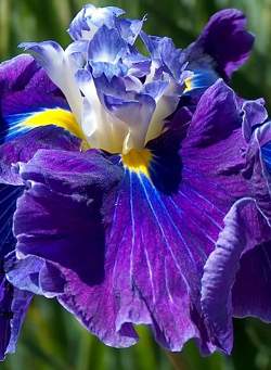 Ирис японский Frosted Intrigue (Фростед Интриг). Совершенно необыкновенный сорт. Лепестки широкие, глубоко-пурпурные с ярко-желтым сигналом, окруженным синей аурой. Стайлы бело-голубые.