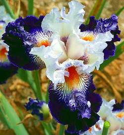 Ирис Froufroutant (Фруфрутан). Ирис космического поколения (бородка имеет пространственное продолжение в виде ложки). Стандарты чисто-белые. Фолы бархатные, фиолетово-коричневые. Бородка красная, переходит в эффектную гофрированную "ложку" того же цвета, что и фолы. Побеги прочные, хорошо разветвлённые.