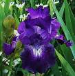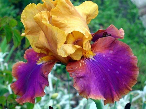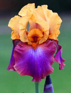 Ирис Gala Madrid (Гала Мадрид). Цветок двухцветный: верхние доли кремово-желтые с лиловым напылением по центру, нижние — лиловые в центре, по краям пурпурные. Сорт морозостоек, неприхотлив, хорошо разрастается, очень красиво смотрится в массивах. Цветение в июне-июле.