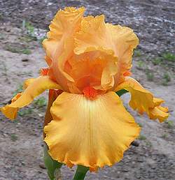 Ирис бородатый — многолетнее корневищное растение. Цветки оригинальной формы на прочном разветвленном цветоносе. На наружных долях околоцветника находится бородка из густых волосков. Листья мечевидные с восковым налетом, собраны в вееровидные пучки. Есть низкорослые и карликовые сорта.