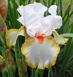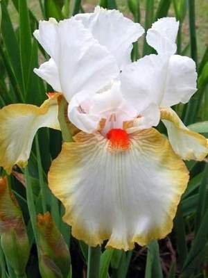 Ирис Halloween Halo (Хэллоуин Хало). Высота ириса около 90 см. Цветение начало июня, возможно повторное цветение в конце августа. Цветок крупного размера, верхние лепестки белого цвета, нижние с бледно-желтой каймой, края лепестков гофрированные. Бородка оранжевая.