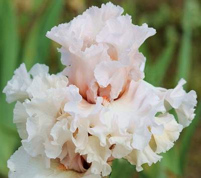 Ирис высокий бородатый Head Over Heels (Хед Овер Хилз). Стандарты и фолы нежно-розовые с перламутровым напылением. Бородка мандариновая. Невероятно красивая гофрировка. Высота 71 см. Срок цветения средний.