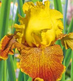 Цветок золотисто-желтого цвета с оранжевым оттенком, украшен декоративным бордово-фиолетовым узором на нижних лепестках, бородка ярко-желтая!