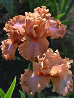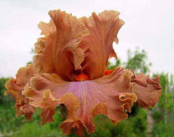 Ирис высокий бородатый Homebody (Хоумбади). Стандарты лососево-оранжевые, фолы цвета стандартов с фиолетовой вспышкой около бородки. Бородка ярко-оранжевая. Красивейшая гофрировка! Срок цветения средний. Высота 102 см.