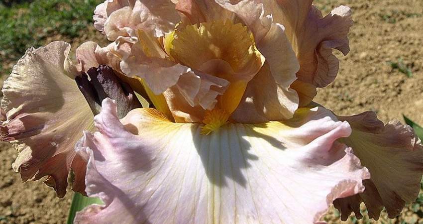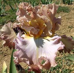 Ирис высокий бородатый Honey Pie (Хани Пай). Кремово-розовый, на фолах по центру лавандовое напыление. Гофрировка головокружительная, особенно на стандартах. Срок цветения средне-ранний. Высота 89 см.
