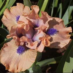 Ирис карликовый Honorary (Онорэри). Потрясающе красивый. Стандарты и фолы персиково-оранжевые. Бородка васильковая, крупная и пушистая. Срок цветения средний. Высота 28 см.