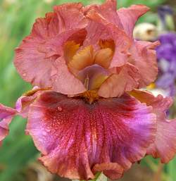 Ирис высокий бородатый Hotsy Totsy (Хотси Тотси). Стандарты медные, более насыщенного цвета по краям. Фолы гранатово-красные с медно-красной каймой. Текстура восковая. Бородка коричневая. Удивительный ирис с красивой гофрировкой. Срок цветения средне-поздний. Высота 74 см.