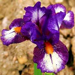 Ирис Hugs (Хагс). Миниатюрный привлекательный сорт, фолы и стандарты фиолетово-лиловые с белыми серединками и вкраплениями. Бородки ярко-оранжевые.