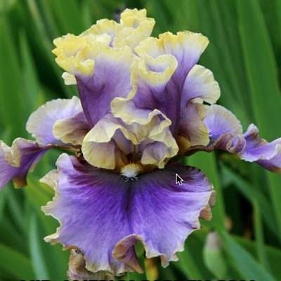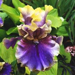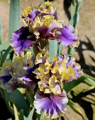 Ирис I'm All Shook Up (Айм Ол Шук Ап). Стандарты дымчато-сливовые с золотистой каймой и пурпурными прожилками. Фолы в той же окраске, темные у основания, к краю светло-голубые. Бородка светло-желтая. Очень красивая гофрировка. Высота 76 см.