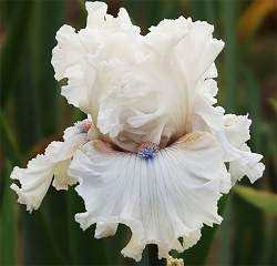 Ирис высокий бородатый I'm Posh (Айм Пош). Стандарты кремово-белые, фолы такие же с медовыми плечиками. Бородка лавандовая, у основания мандариновая. Изящный, красиво гофрирован. Срок цветения средне-поздний. Высота 89 см.