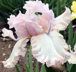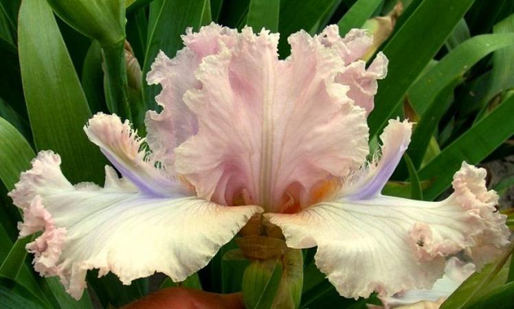 Ирис высокий бородатый Isadora Belle (Исадора Белль). Стандарты бледно-лавандовые с розовинкой. Фолы белые с каймой цвета стандартов. Бородка мандариновая с крупным петалоидом. Очень красиво гофрирован. Срок цветения средний. Высота 79 см.