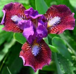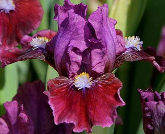 Ирис карликовый Jeopardy (Джепади). Стандарты пурпурные. Фолы красные с каймой цвета стандартов. Бородка золотистая, на кончике светло-фиолетовая. Срок цветения средне-поздний. Высота 30 см.