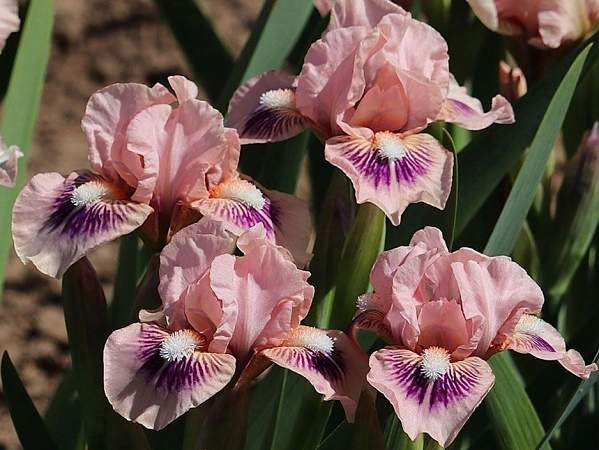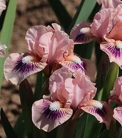 Ирис бородатый карликовый Jewels (Джуэлс). Стандарты пастельно-розовые, фолы такие же, с бордово-фиолетовым жилкованием. Бородка мандариновая с белым кончиком. Срок цветения средний. Высота 38 см.
