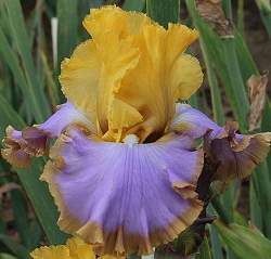 Ирис высокий бородатый Just a Fling (Джаст э Флинг). Стандарты золотистые, фолы лавандовые с коричневой каймой. Бородка белая с желтым напылением. Срок цветения средне-ранний, высота 91 см. Очень нарядный, необычный. На лепестках красивая гофрировка.