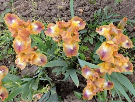 Ирис карликовый Assorted Flavors (Ассортед Флейворз). Стандарты медные. Фолы фиолетовые с синим вливанием в центре. Кайма старого золота. Плечики сливочно-желтые. Бородка медно-оливковая с мандариновым. Срок цветения средний, высота 25 см.