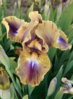 Ирис карликовый Assorted Flavors (Ассортед Флейворз). Стандарты медные. Фолы фиолетовые с синим вливанием в центре. Кайма старого золота. Плечики сливочно-желтые. Бородка медно-оливковая с мандариновым. Срок цветения средний, высота 25 см.