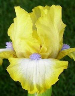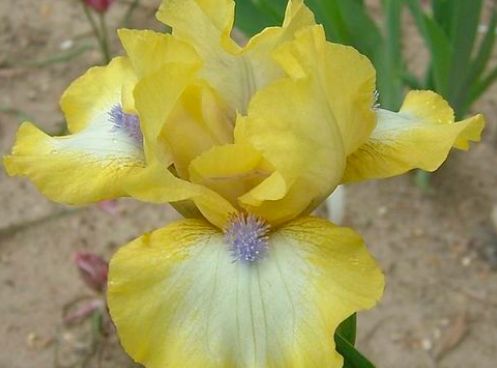 Ирис карликовый Bluebeard's Gold (Блубиэд Голд). Стандарты желтые. Фолы белые с каймой цвета стандартов. Бородка голубая. Очень красивый гофрированный цветок. Срок цветения средне-ранний, высота 30 см. Имеет награду.