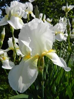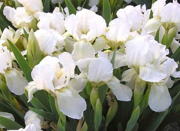 Ирис карликовый Dream Stuff (Дрим Стафф). Высота около 30 см. Цветки крупные (9 см в диаметре). Стандарты чисто-белые, с желто-зелеными плечиками. Бородка в основании желтая, к краю белая. Неприхотлив. Отлично растет на сухих местах с щелочной почвой.