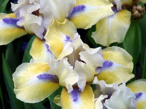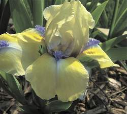 Ирис карликовый Sarah Taylor (Сара Тэйлор). Выигрышный на клумбе, обаятельный карликовый ирис. Лепестки желтовато-белые, с широкими желтыми перьями, бородка темно-синяя. Высота 20 см. Цветет в мае. Легко разрастается.