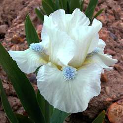 Ирис бородатый карликовый Snow Season (Сноу Сизн). Цветок отличается невероятной окраской. Лепестки белые, у основания с желтыми штрихами. Бородка небесно-голубая. Цветет рано, неприхотлив, быстро разрастается.