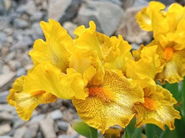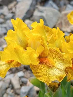 Ирис карликовый Victory March (Виктори Марч). Стандарты золотисто-желтые. Фолы золотые с темной сеточкой (пликата). Бородка очень яркая, оранжевая Срок цветения средний. Высота 25 см.