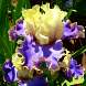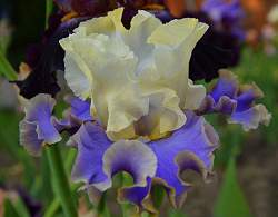 Ирис Kona Waves (Кона Вэйвз). Цветки с сильной гофрировкой. Стандарты от кремовых до масляно-жёлтых. Фолы почти горизонтальные, сине-фиолетовые с бледно-бежевой каймой шириной 6 мм. Бородка жёлтая с фиолетовым кончиком. Почётный отзыв, 2007 г. Награда за качество, 2009 г.