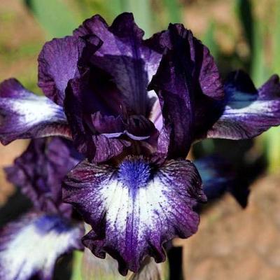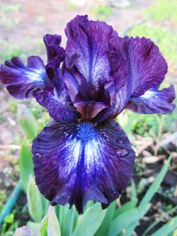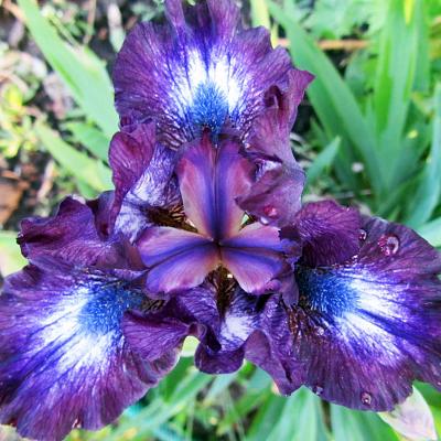 Ирис карликовый Larrikin (Ларрикин). Превосходный новый сорт. Цветки выразительные, стандарты почти полностью чернильно-синие, фолы имеют высветление в центре лепестка, на котором бородка играет как сапфир. Синие штрихи придают цветку сложность, он не смотрится как кукольный.
