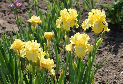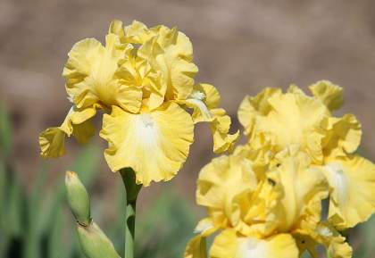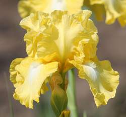 Ирис Lemon Pop (Лемон Поп). Сорт из группы интермедиа. Цветок гофрированный, классической формы, немного взъерошенный. Фолы и стандарты насыщенно лимонно-желтые. На фолах в районе бородки белое пятно. Бородки белые у переднего края и желтые в горловине. Высота 41 см. Срок цветения ранний.