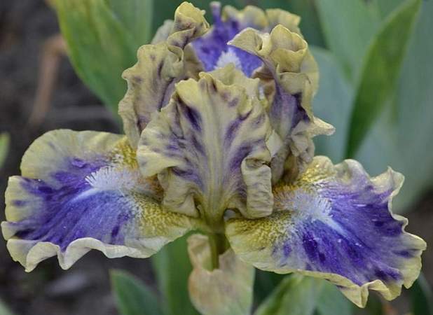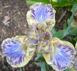 Ирис карликовый Leopard Print (Леопард Принт). Стандарты бежевые с фиолетовыми вкраплениями. Фолы голубые с каймой цвета стандартов. Бородка желтая с голубым. Срок цветения средний. Высота 30 см.