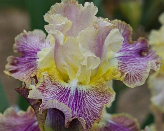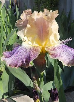 Ирис высокий бородатый Lightsaber (Лайтсэйбер). Нежные сливочно-кремовые стандарты с фиолетовым вливанием по центральной жилке. Фолы – сиреневая люмината на белом фоне с тонкой атласной окантовкой. Плечики желтые. Бородка белая, заканчивающаяся петалоидом. Имеет легкий аромат специй. Очень красиво гофрирован. Срок цветения средне-ранний. Высота 94 см.