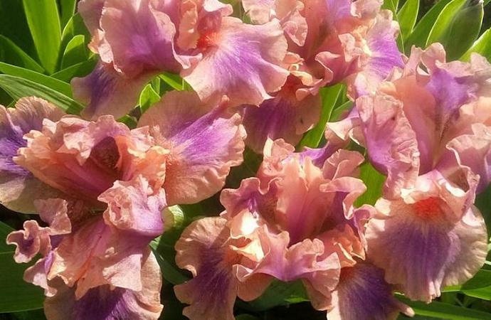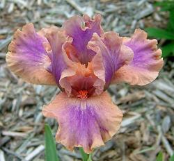 Ирис карликовый Love Spell (Лав Спелл). Стандарты персиково-розовые с фуксиновым вливанием по центру жилки. Фолы персиковые с большим пятном цвета фуксии. Бородка ярко-оранжевая. Срок цветения средний. Высота 36 см. Имеет награды.