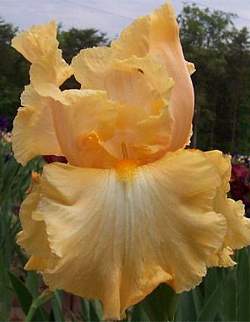 Ирис Lovely Light (Лавли Лайт). Высота 80 см. Цветоносы разветвленные. Цветок крупный, округлый, необыкновенно-приятной окраски — персиково-желтый с розовым отливом. В центре фола посветление, в центре которого прелестно смотрится бородка апельсинового цвета.