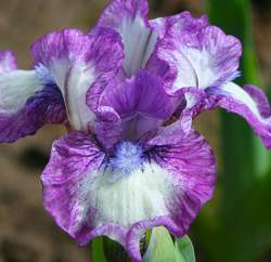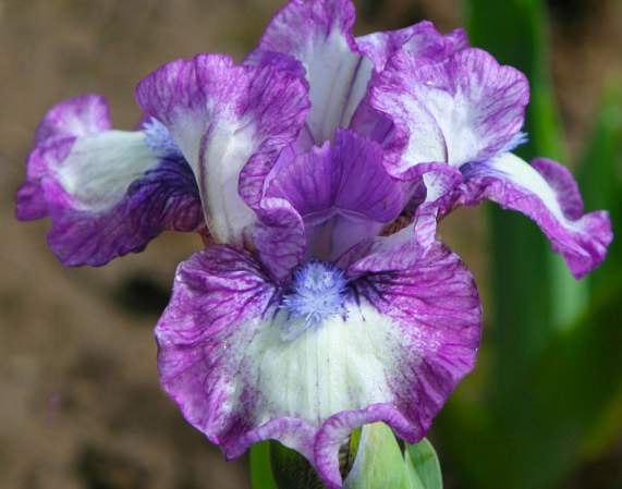 Ирис бородатый карликовый Lucky (Лаки). Стандарты белые с широкой сиреневой каймой-пликатой. Фолы белые с такой же каймой и темно-пурпурными жилками на плечиках. Бородка белая с синевато-фиолетовым напылением. Срок цветения средне-поздний. Высота 36 см.