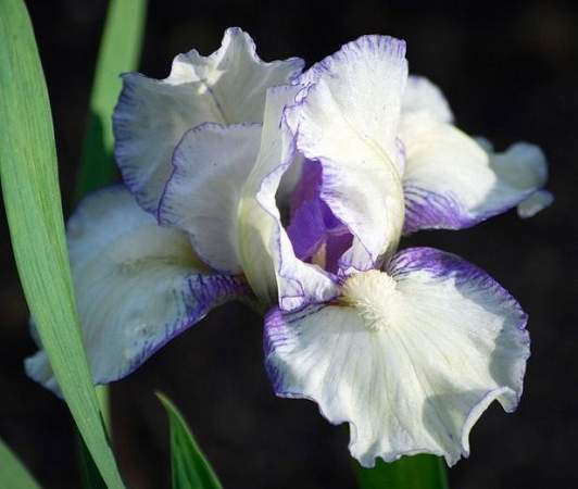 Ирис карликовый Lucy's Choice (Люсиз Чойс). Стандарты и фолы белые. У стандартов тонкая лавандовая кайма. У фолов лавандовые плечики. Бородка белая. Высота 30-45 см. Срок цветения средний.