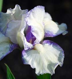 Ирис карликовый Lucy's Choice (Люсиз Чойс). Стандарты и фолы белые. У стандартов тонкая лавандовая кайма. У фолов лавандовые плечики. Бородка белая. Высота 30-45 см. Срок цветения средний.