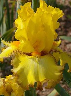 Ирис Macaron (Макарон). Стандарты ярко-желтые, плечики более светлые. Бородка оранжевая с мягким перистым рогом. Цветки округлой формы, плотные. Цветет обильно! Высота 89 см, срок цветения поздний.