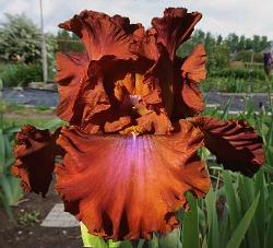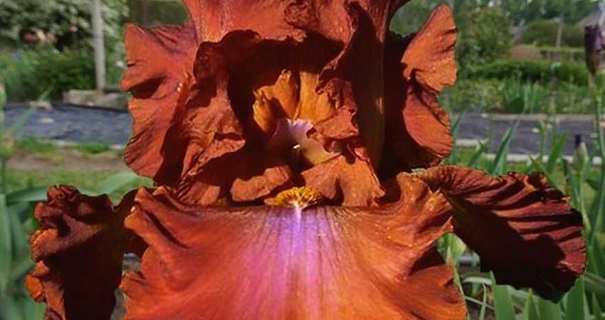 Ирис высокий бородатый Mad World (Мэд Ворлд). Бронзово-красный, на фолах фиолетовая вспышка в центре. Бородка золотая. Красивый и интересный сорт. Срок цветения средний. Высота 91 см.