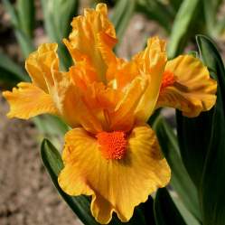 Ирис карликовый Marksman (Максмэн). Очень яркий цветок. Стандарты по цвету и форме как пламя. Фолы чуть темнее с медными жилками. Бородка алая. Высота 33 см. Срок цветения средний. Имеет награды.