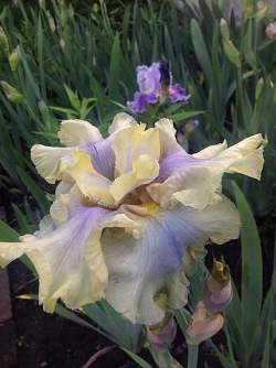 Ирис высокий бородатый Mary Contrary (Мэри Контрари). Стандарты и фолы молочно-бежевые. Фолов шесть, на них голубовато-белое напыление. Бородка желто-белая. Очень крупный, необычный, красиво гофрированный. Срок цветения средний. Высота 97 см.