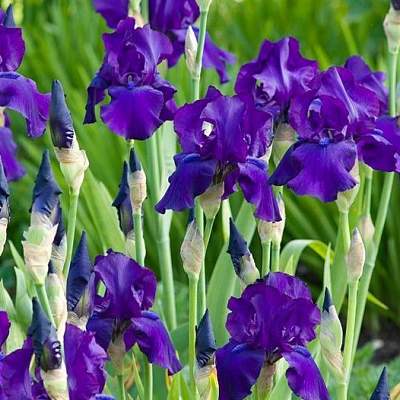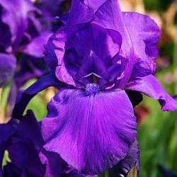 Ирис германский Matinata (Матината). Крупные (15 см) бархатистые цветки глубокого фиолетового цвета. Стандарты и фолы окрашены одинаково, бородка синеватая. Цветки имеют приятный сильный аромат. Неприхотливый, быстро разрастающийся сорт. Высота до 120 см. Ширина куртины около 50 см.